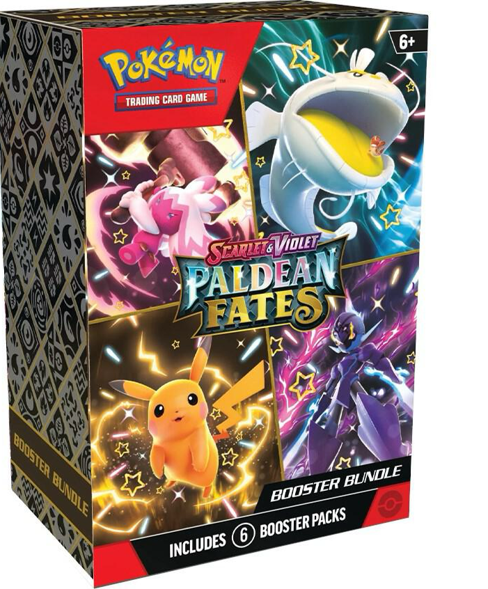 The spotlight glistens on Shiny Pokémon making their fated return to the Pokémon TCG! Shiny Pikachu blazes the path forward as Tinkaton, Ceruledge, Dondozo, and more than 100 other Shiny Pokémon follow. Meanwhile, Great Tusk and Iron Treads appear as Ancient and Future Pokémon ex, and Charizard, Forretress, and Espathra show off their own unique skills as Shiny Tera Pokémon ex. Shed some light and discover sparkling wonders in the Scarlet & Violet—Paldean Fates expansion! Expand your collection with this Booster Bundle containing six booster packs from Pokémon TCG: Scarlet & Violet—Paldean Fates!